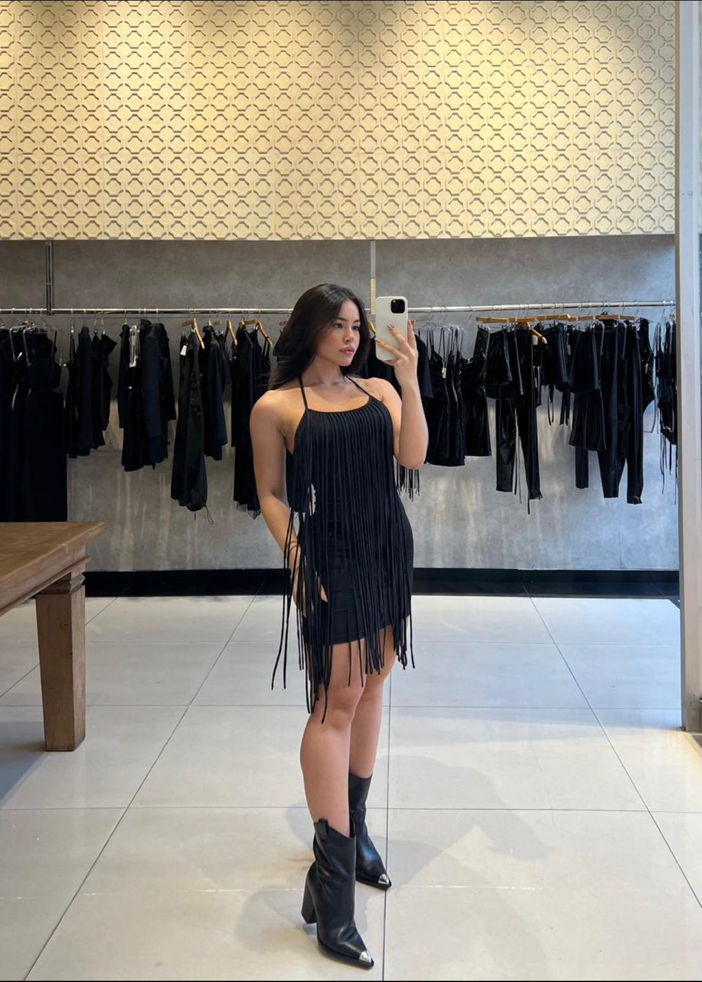 Nosso vestido preto LAUANA é uma escolha elegante para qualquer ocasião. Com seu detalhe de franjas, ele adiciona um toque de estilo e movimento ao seu look. Feito com materiais de alta qualidade, ele garantirá conforto e durabilidade em seu guarda-roupa. Vista-se com confiança e estilo com este vestido.